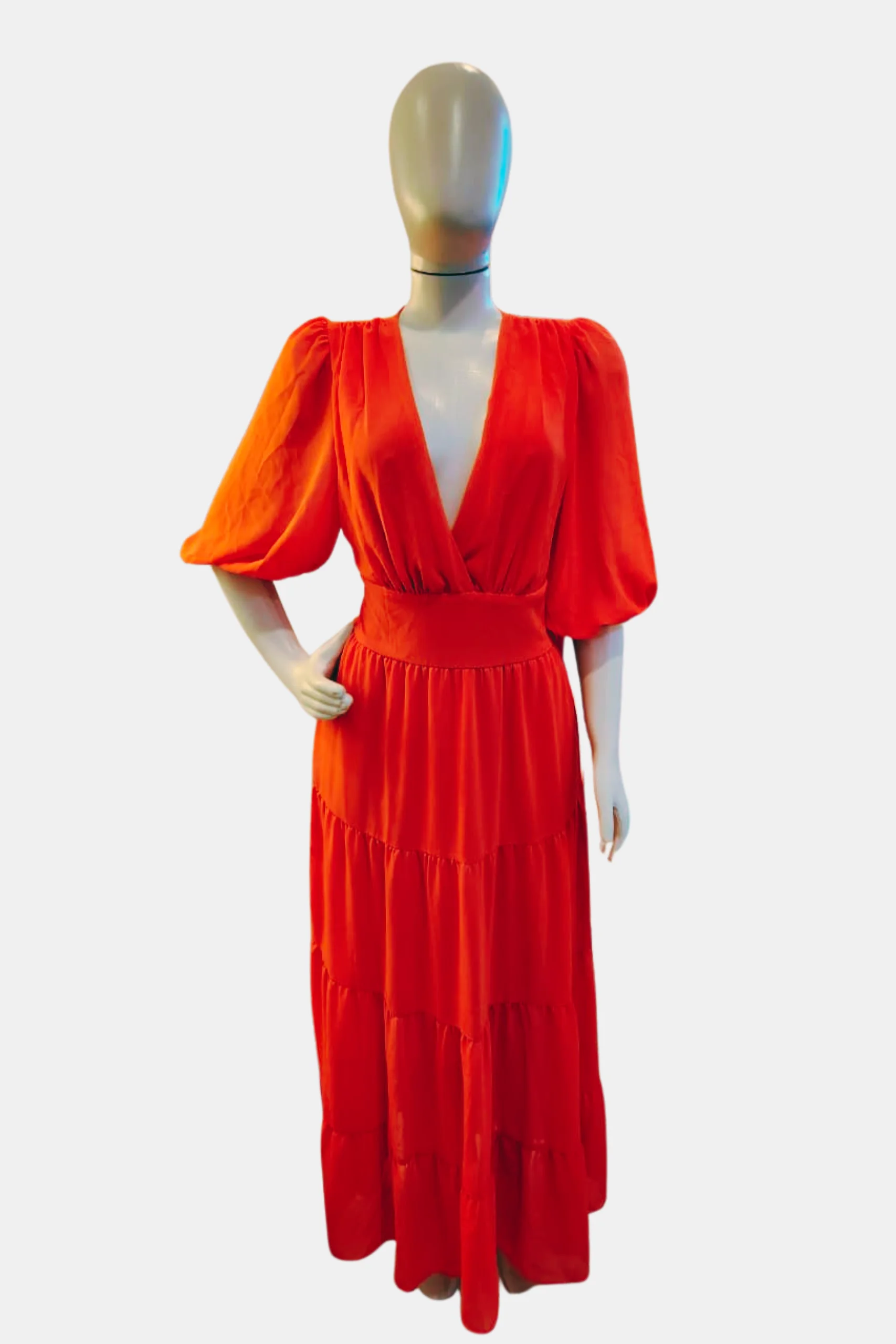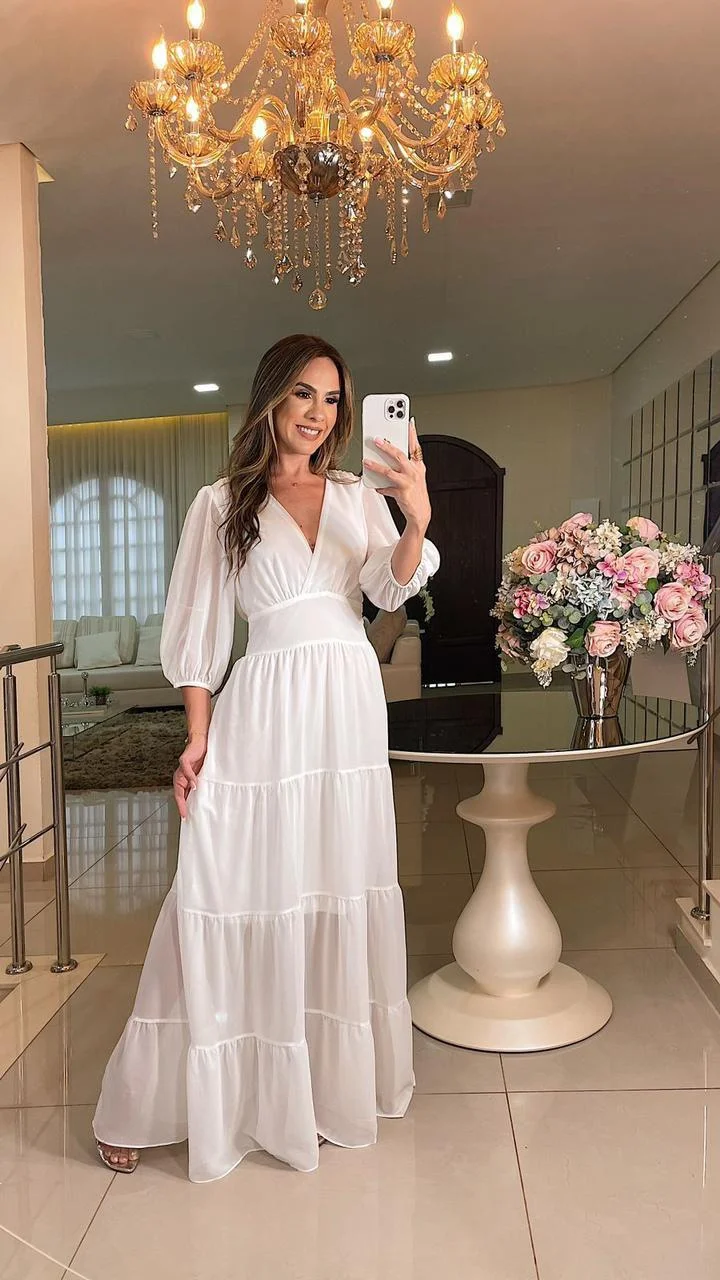 Descrição da peça: Vestido longo com magas bufantes e decote em formato V.