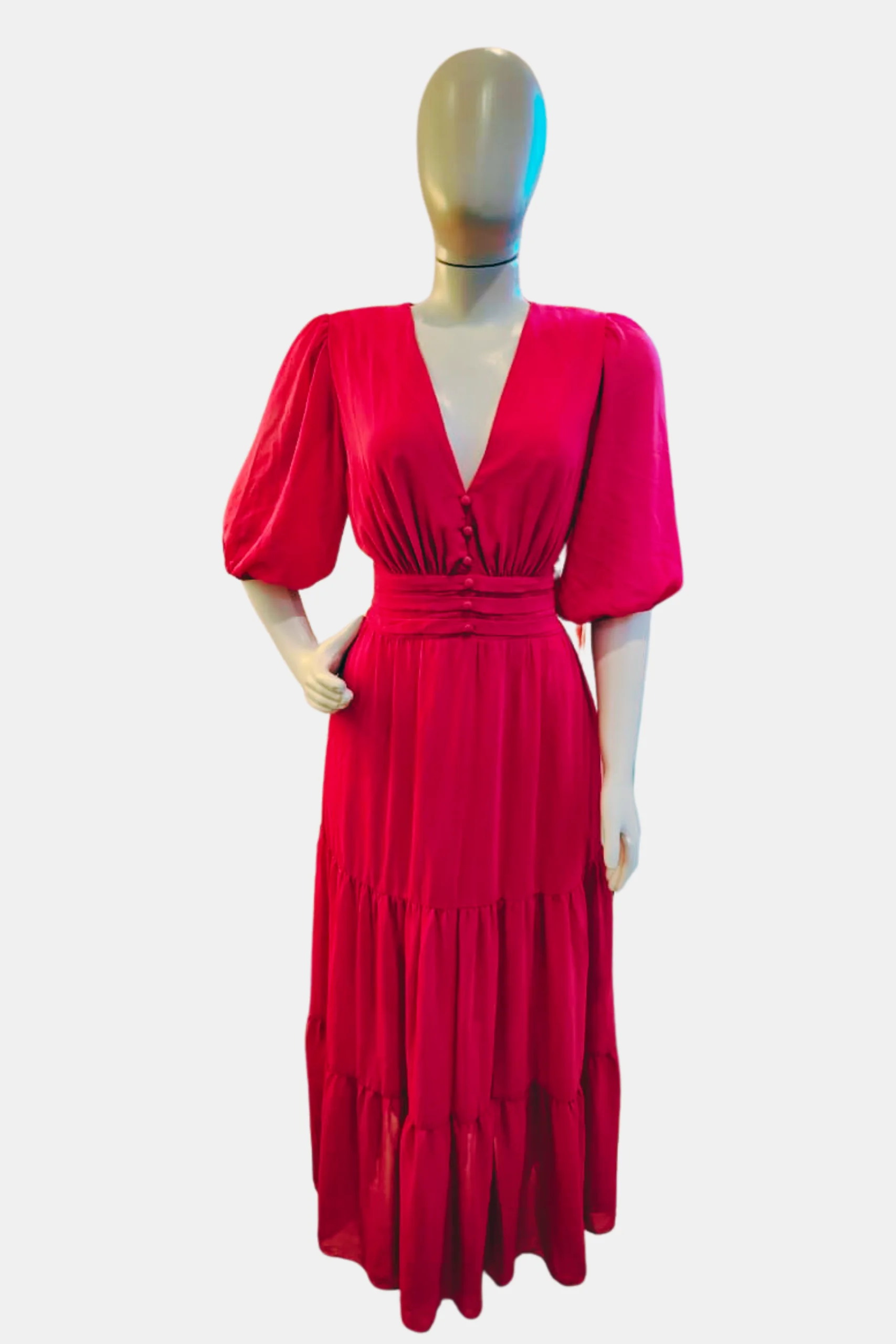 Descrição da peça: Vestido longo com magas bufantes e decote em formato V.