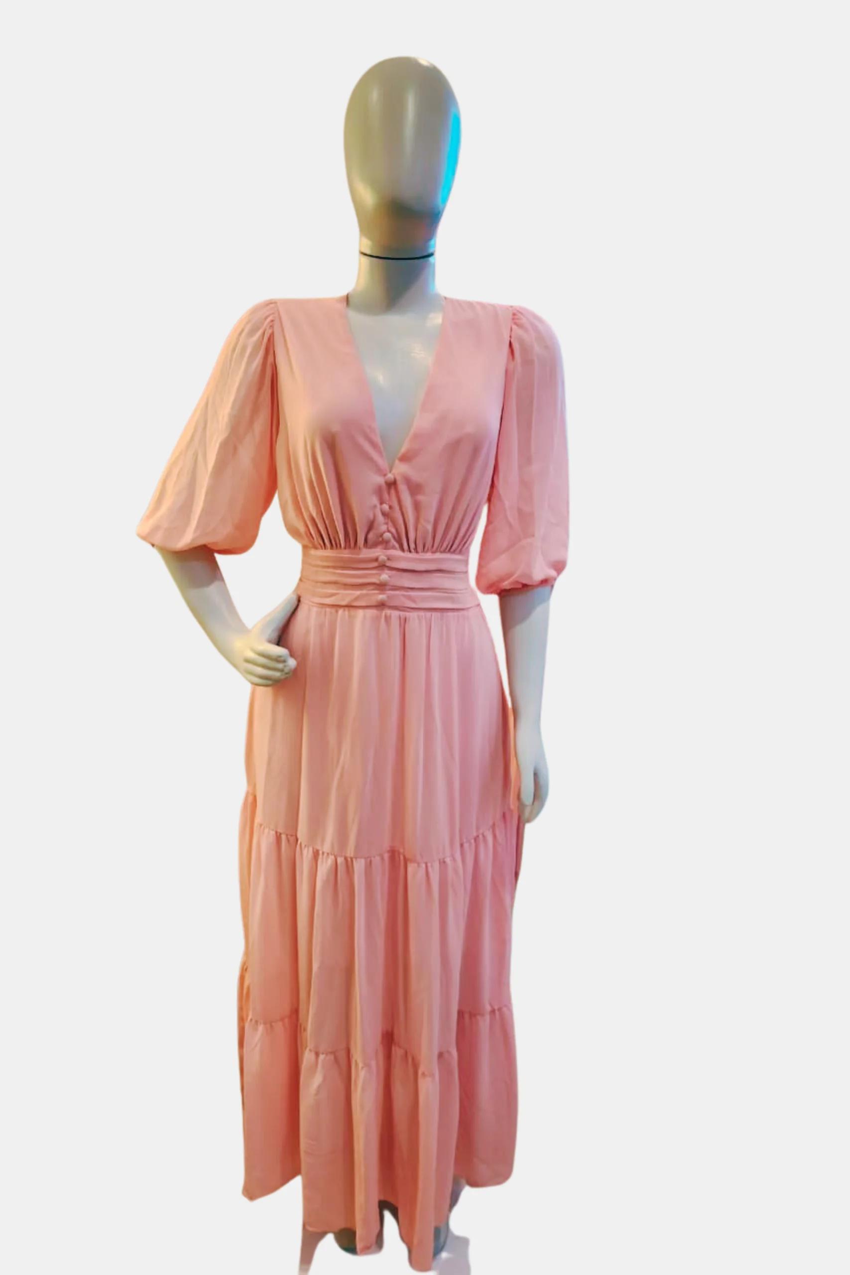 Descrição da peça: Vestido longo com magas bufantes e decote em formato V.